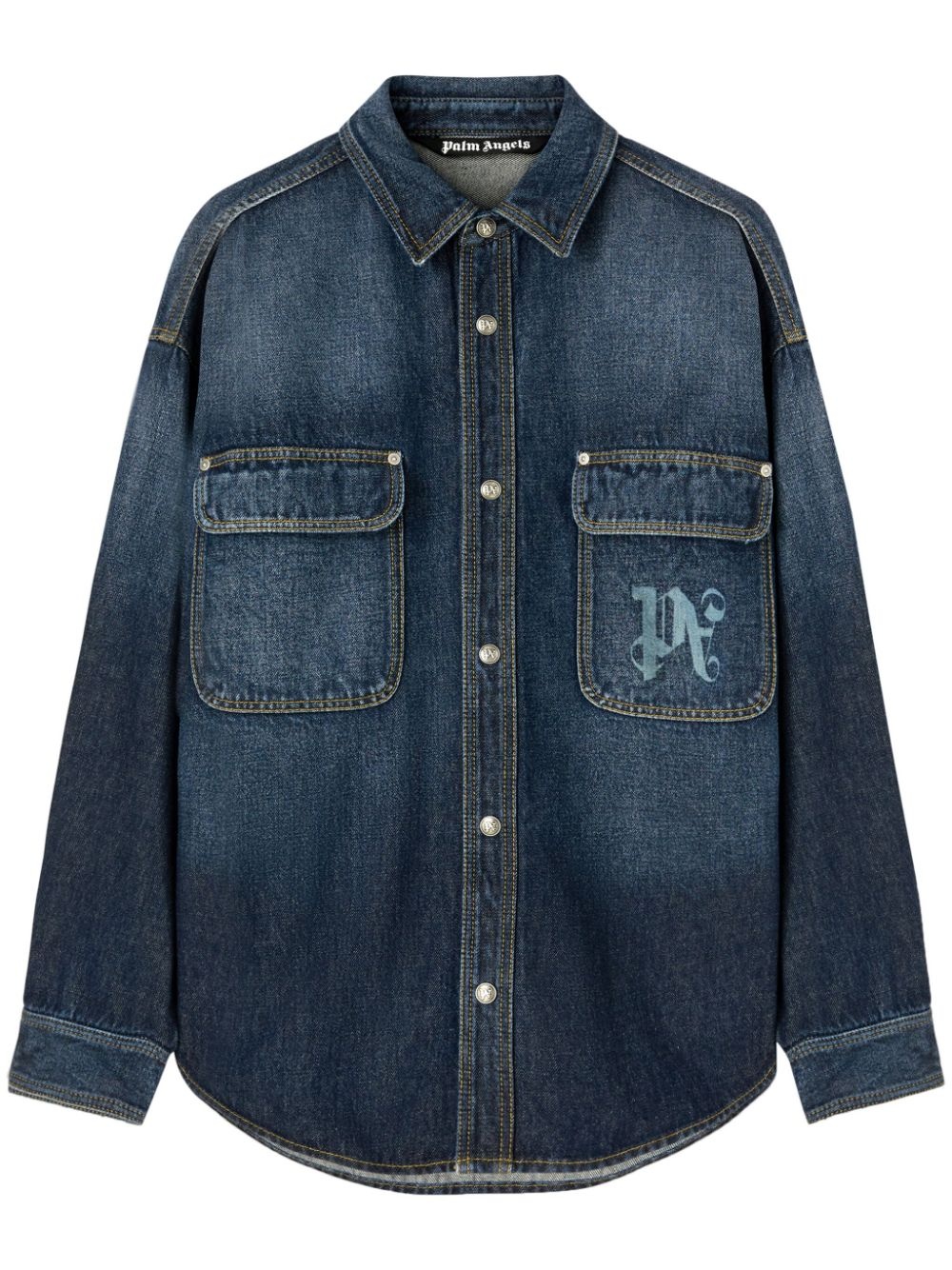 logo-print denim shirt Highlights - Indigo blue - Cotton - Denim - Dark wash - Logo print at the chest - Rivet detailing - Silver-tone hardware - Classic collar - Press-stud placket - Drop shoulder - Long sleeves - Press-stud fastening cuffs - Two chest flap pockets - Curved hem Imported Composition Cotton 100%