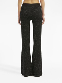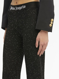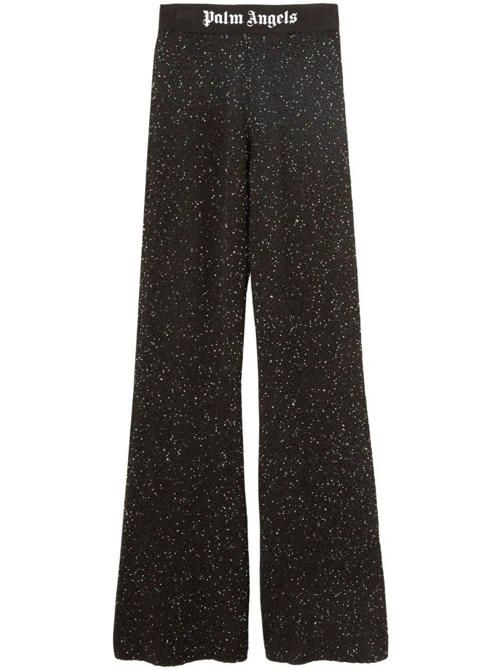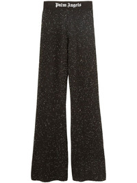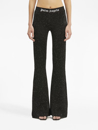 logo-print knitted flared trousers Palm Angels straddle the line between casual and statement with these trousers. Set on a logo-print elasticated waistband, they’re cut to a flared silhouette and woven with glittered threads. Highlights - Black/white - Stretch-design - Lurex detailing - Logo waistband - Elasticated waistband - Flared Made in Italy Composition Polyester 76%, Viscose 18%, Polyamide 6% SIZE & FIT Measurement FRONT RISE 9.84 in(25 cm) HIPS 30.7 in(78 cm) WAIST 25.19 in(64 cm)