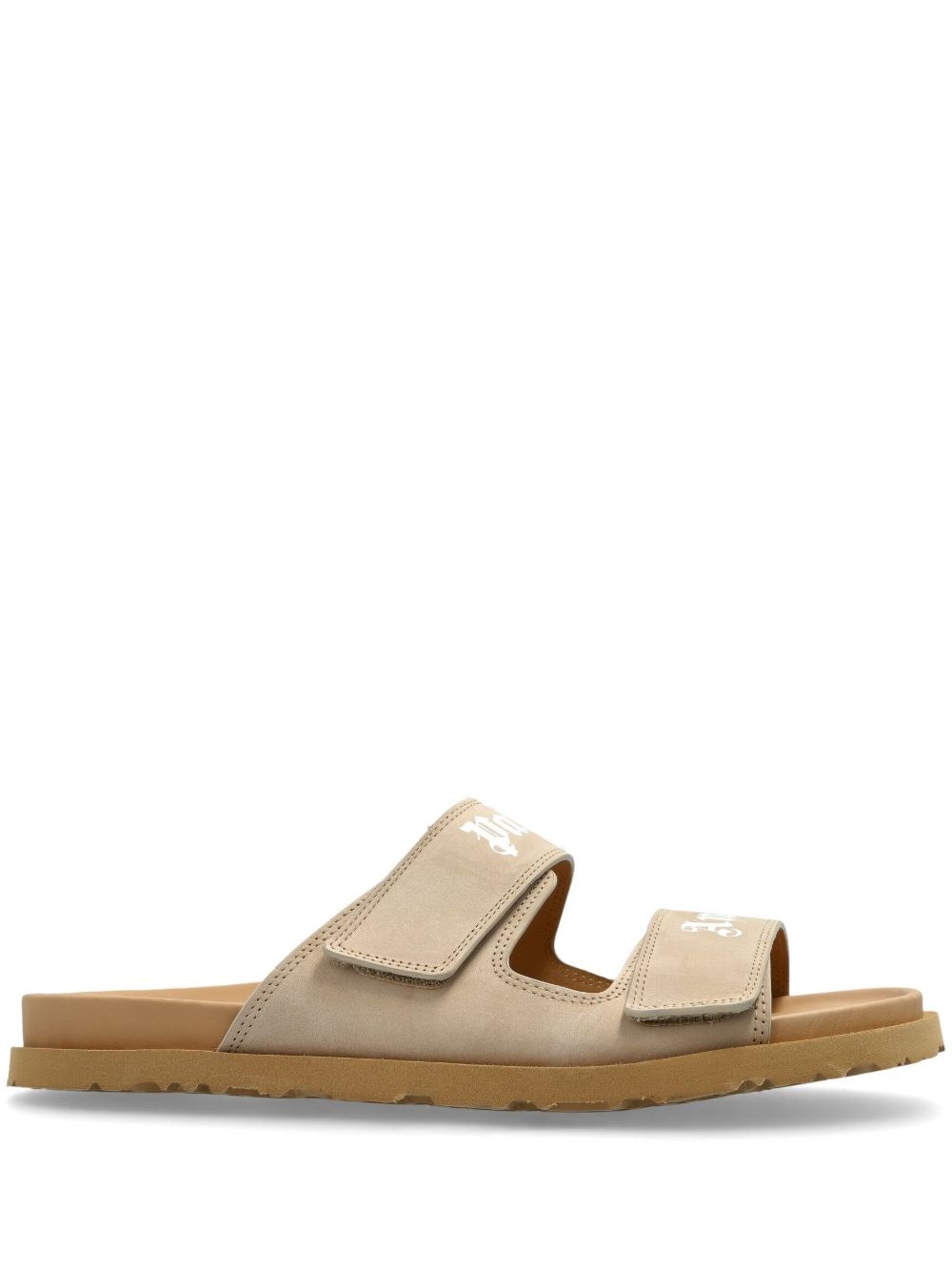 logo-print leather slides Highlights - Light beige - Slip-on style - Touch-strap fastening - Flat rubber sole Imported Composition Outer: Calf Leather 100% Sole: Rubber 100% Lining: Calf Leather 100%