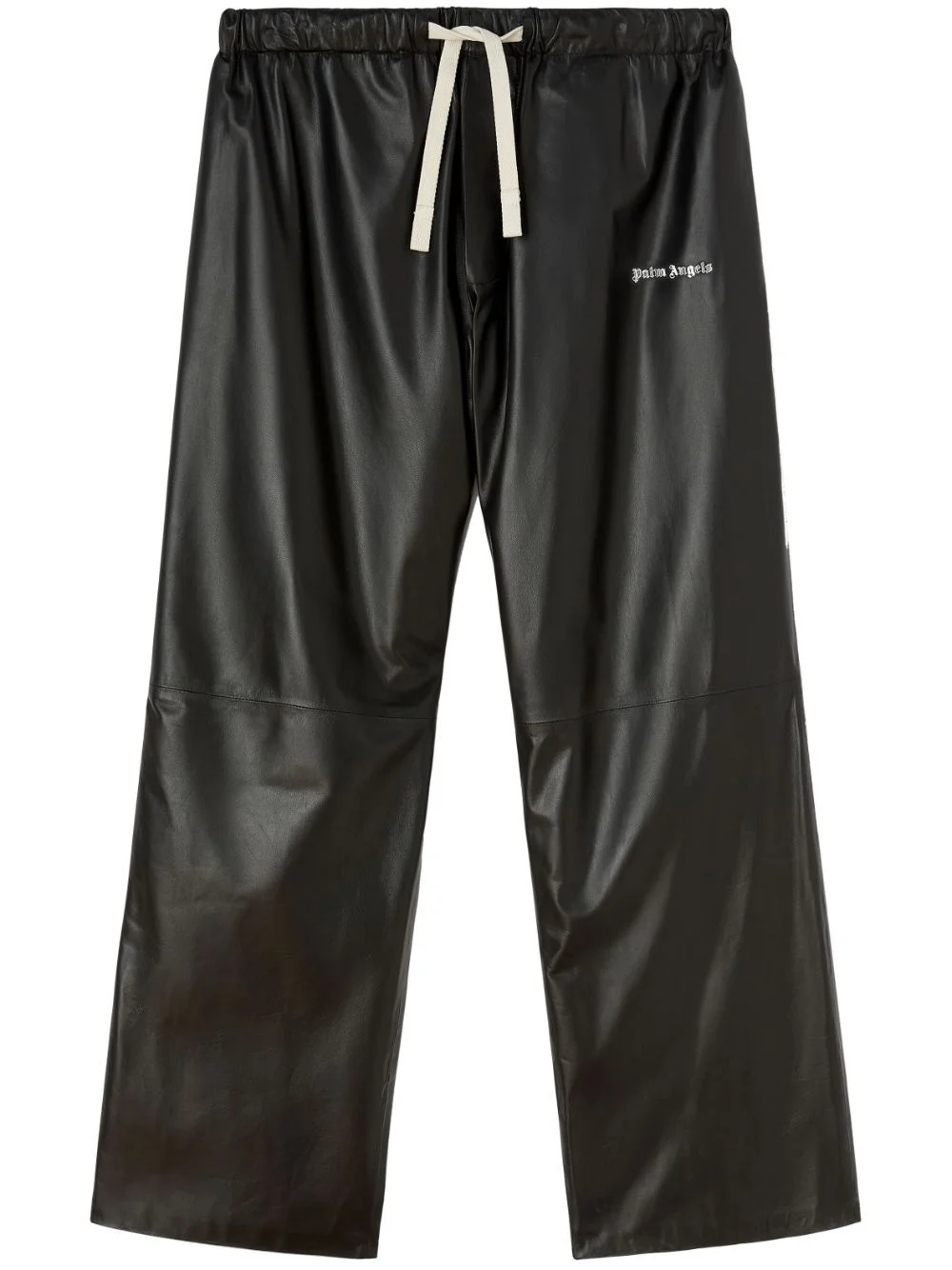 logo-print leather track pants Palm Angels' track pants are constructed from black leather and subtly accented with the brand's signature in contrasting silver for a distinctive touch. Highlights - Black - Leather - Elasticated drawstring waistband - Logo print to the side - Two side slit pockets - Two rear welt pockets - Straight leg Imported Composition Outer: Leather 100% Lining: Viscose 100%, Cotton 100%