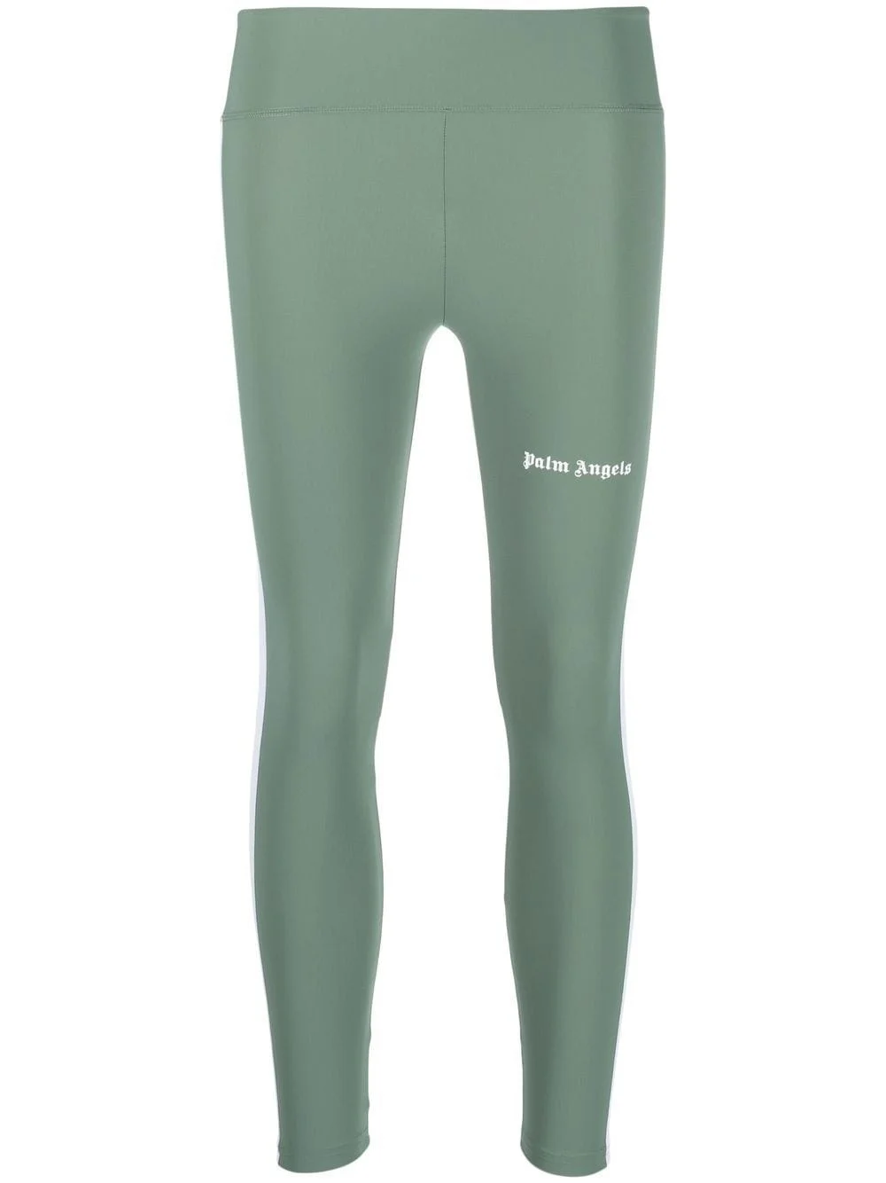 logo-print leggings These leggings from Palm Angels arrive in a sage hue, complete with a cropped silhouette, leading to the brand's contemporary streetwear-inspired aesthetic. Made in Italy Composition Polyester 100%, Polyamide 72%, Spandex/Elastane 28% SIZE & FIT Model measurements Height 5 ft 9 in(1.76 m) Bust/Chest 31.88 in(81 cm) Hips 35.43 in(90 cm) Waist 24.8 in(63 cm) FittingInformation This piece fits true to size. We recommend you get your regular size Cut for a close fit Made with a mid-weight stretch fabric Washing instructions Machine Wash