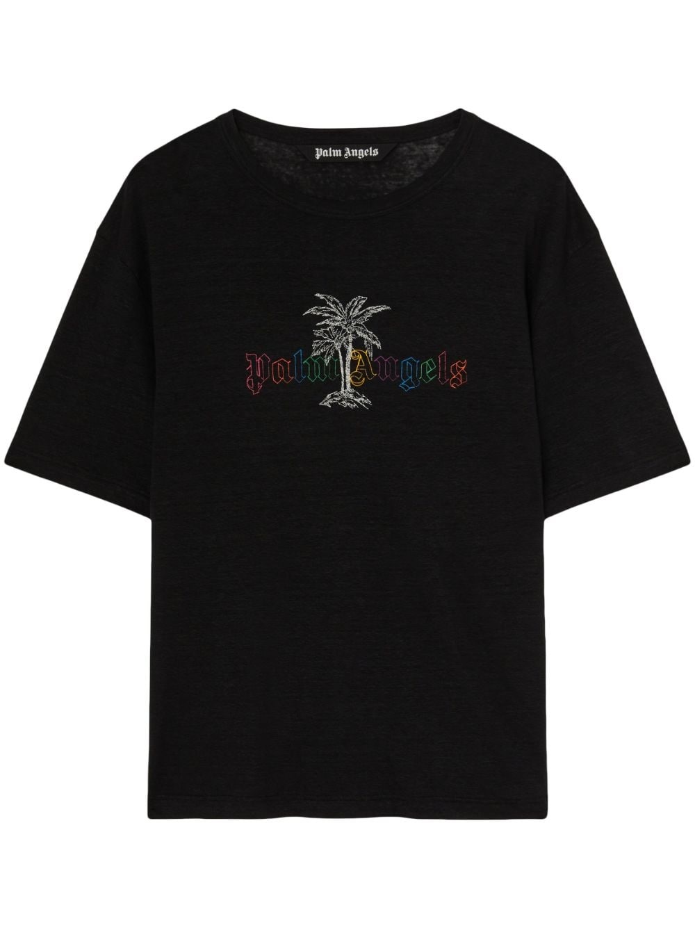 logo-print short-sleeve T-shirt Made from a blend of cotton and linen, this black T-shirt by Palm Angels is adorned with the brand's ever-recognisable palm tree motif and rainbow logo lettering in an ink drawing effect. Highlights - Black - Cotton-linen blend - Palm tree print - Logo print to the front - Mini logo tag - Crew neck - Short sleeves - Drop shoulder - Straight hem Made in Italy Composition Cotton 70%, Linen/Flax 30% SIZE & FIT FittingInformation Designed for a regular fit allowing for a comfortably loose fit throughout the body This piece fits true to size – take your usual size