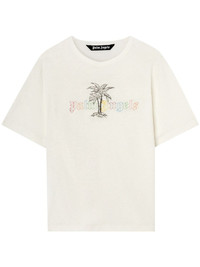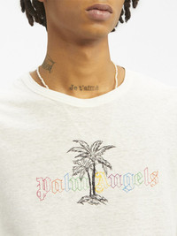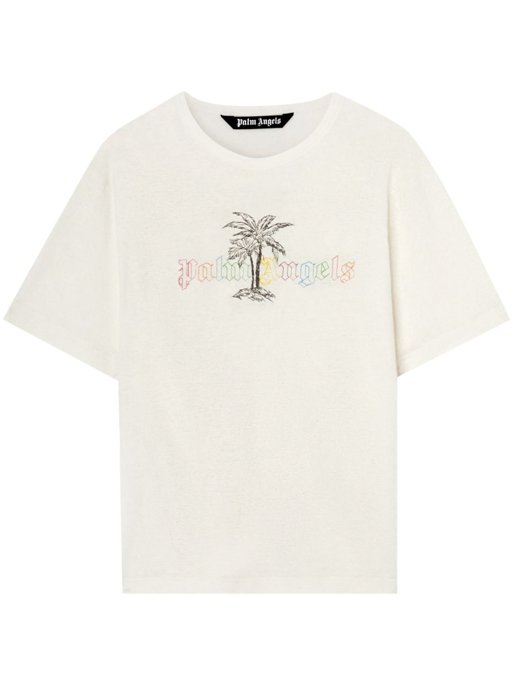 logo-print short-sleeve T-shirt Made from a blend of cotton and linen, this white T-shirt by Palm Angels is adorned with the brand's ever-recognisable palm tree motif and rainbow logo lettering in an ink drawing effect. Highlights - Optical white - Cotton-linen blend - Palm tree print - Logo print to the front - Mini logo tag - Crew neck - Short sleeves - Straight hem Made in Italy Composition Cotton 70%, Linen/Flax 30% SIZE & FIT FittingInformation Designed for a regular fit allowing for a comfortably loose fit throughout the body This piece fits true to size – take your usual size