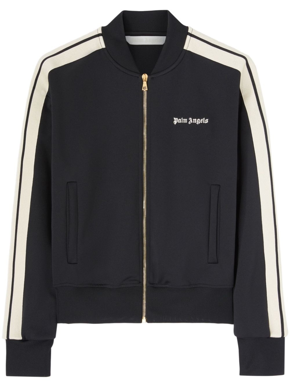 logo-print track bomber jacket Palm Angels fuses elements from track and bomber silhouettes to create this black jacket. Its welt pockets, rounded ribbed collar and matching trims nod to military designs, while its striped sleeves and logo print stay true to the label’s signature sporty styles. Highlights - Navy blue/light beige - Side stripe detailing - Logo print at the chest - Ribbed band collar - Front zip fastening - Long sleeves - Two side slit pockets - Ribbed cuffs and hem Made in Italy Composition Lining: Polyester 100% Outer: Polyester 100%