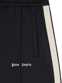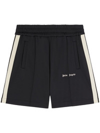 logo-print track shorts A thigh-length version of its famed track pants, these black and white Palm Angels shorts stay true to their roots with their side stripes and raised centre seams. An Old English logo is embroidered at the front in signature form. Highlights - Black/ecru - Recycled polyester - Jersey texture - Elasticated waistband - Raised seam detail - Two side welt pockets - Side stripe detailing - Embroidered logo at the leg - Thigh-length - Unlined - Authenticity qr code Made in Italy Composition Outer: Polyester 100% Lining: Polyester 100% SIZE & FIT Measurement FRONT RISE 14.01 in(35.6 cm) BACK RISE 15.98 in(40.6 cm) HIPS 40 in(101.6 cm) WAIST 27.99 in(71.1 cm)