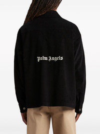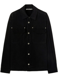 logo-print velvet overshirt Palm Angels' velvet shirt jacket is printed with tattoo-inspired logo lettering on the back. Highlights - Black - Cotton - Velvet - Logo print to the rear - Classic collar - Front button fastening - Long sleeves - Buttoned cuffs - Two chest flap pockets - Straight hem Made in Italy Composition Cotton 100%, Polyester 100% Washing instructions Read Manufacturer Guidelines