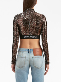 logo-strap sequin cropped top Palm Angels adds a sparkling touch to this cropped top, by fully covering it with light-catching sequins. Fastened with an invisible back zip, it is cut to a fitted silhouette and boasts the brand's recurrent logo strap by the hem. Highlights - Brown/black - Sequin design - High neck - Concealed rear zip fastening - Long sleeves - Straight hem - Logo-print strap - Cropped Made in Italy Composition Outer: Polyester 100% Lining: Polyamide 82%, Spandex/Elastane 18% SIZE & FIT FittingInformation Designed for a close fit throughout This piece fits true to size – take your usual size