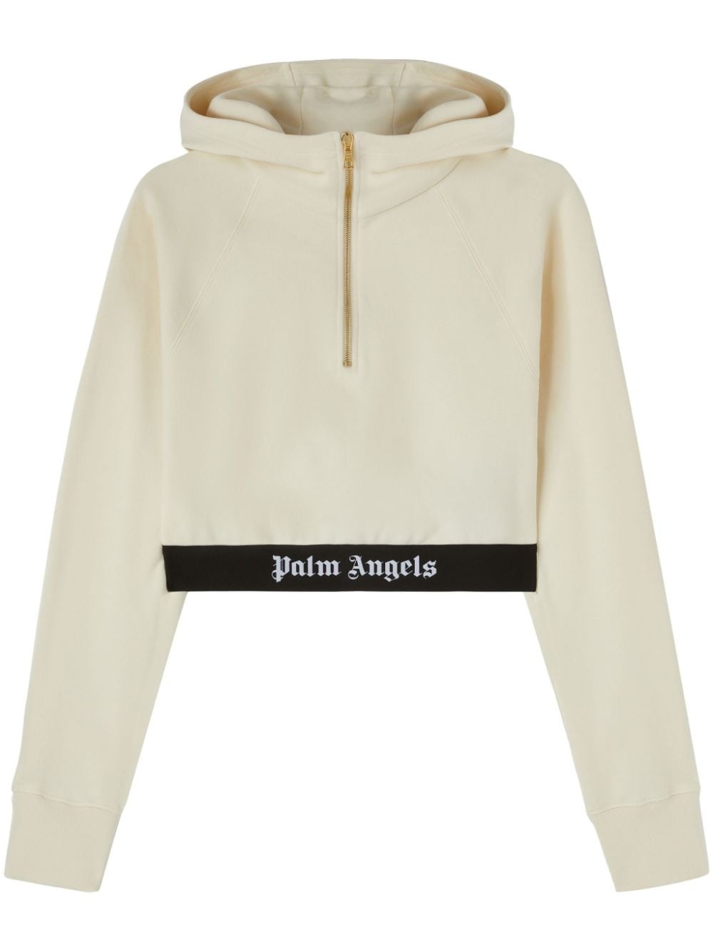 logo-tape cropped hoodie Palm Angels creates streetwear garments with a creative yet relaxed feel, as showcased by this hoodie. Imagined in a light beige hue, the garment is decorated with a logo tape for a distinctive branding note. Highlights - Light beige - Cotton - Elasticated logo waistband - Classic hood - Front zip fastening - Long sleeves - Straight hem - Cropped Made in Italy Composition Cotton 100%, Polyamide 67%, Polyester 23%, Elastane 10%