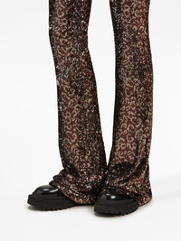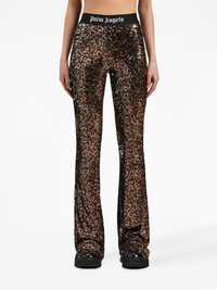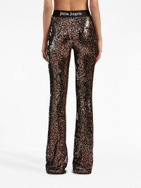 logo-tape sequin flared trousers Sitting high on the waist, these flared trousers by Palm Angels are fully covered with light-catching sequins for a glamorous touch. The brand's recurrent logo tape gives the garment a recognisable touch. Highlights - Brown/black - Stretch-design - Sequin design - Logo-tape detailing - High waist - Flared Made in Italy Composition Lining: Polyamide 82%, Spandex/Elastane 18% Outer: Polyester 100%