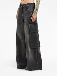 low-rise wide-leg jeans Marrying exaggerated silhouettes with signature details, Palm Angels presents these wide-leg jeans for AW23. Decorated with two oversized cargo pockets to the sides, the faded black pair is adorned with a brown logo patch to the rear. Highlights - Black/brown - Cotton - Denim - Whiskering effect - Low-rise - Belt loops - Front button and zip fastening - Classic five pockets - Two side cargo pockets - Logo patch to the rear - Wide leg Made in Italy Composition Outer: Cotton 100% Leather 100% Lining: Cotton 100%