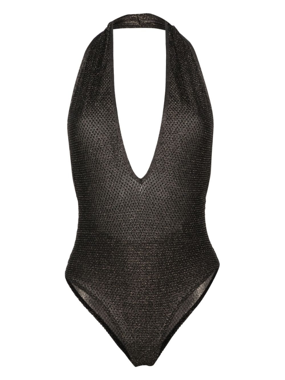 lurex V-neck swimsuit Highlights - Black/gold-tone - Stretch-design - Mesh design - Lurex detailing - One-piece design - Halterneck strap - Plunging v-neck - Sleeveless - High cut - Open back - Gold-tone logo plaque to the rear - Full lining - Pull-on style - Be mindful to try on swimwear over your own garments. Made in Italy Composition Polyamide 81%, Metallic Fibre 13%, Elastane 6% Washing instructions Hand Wash