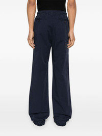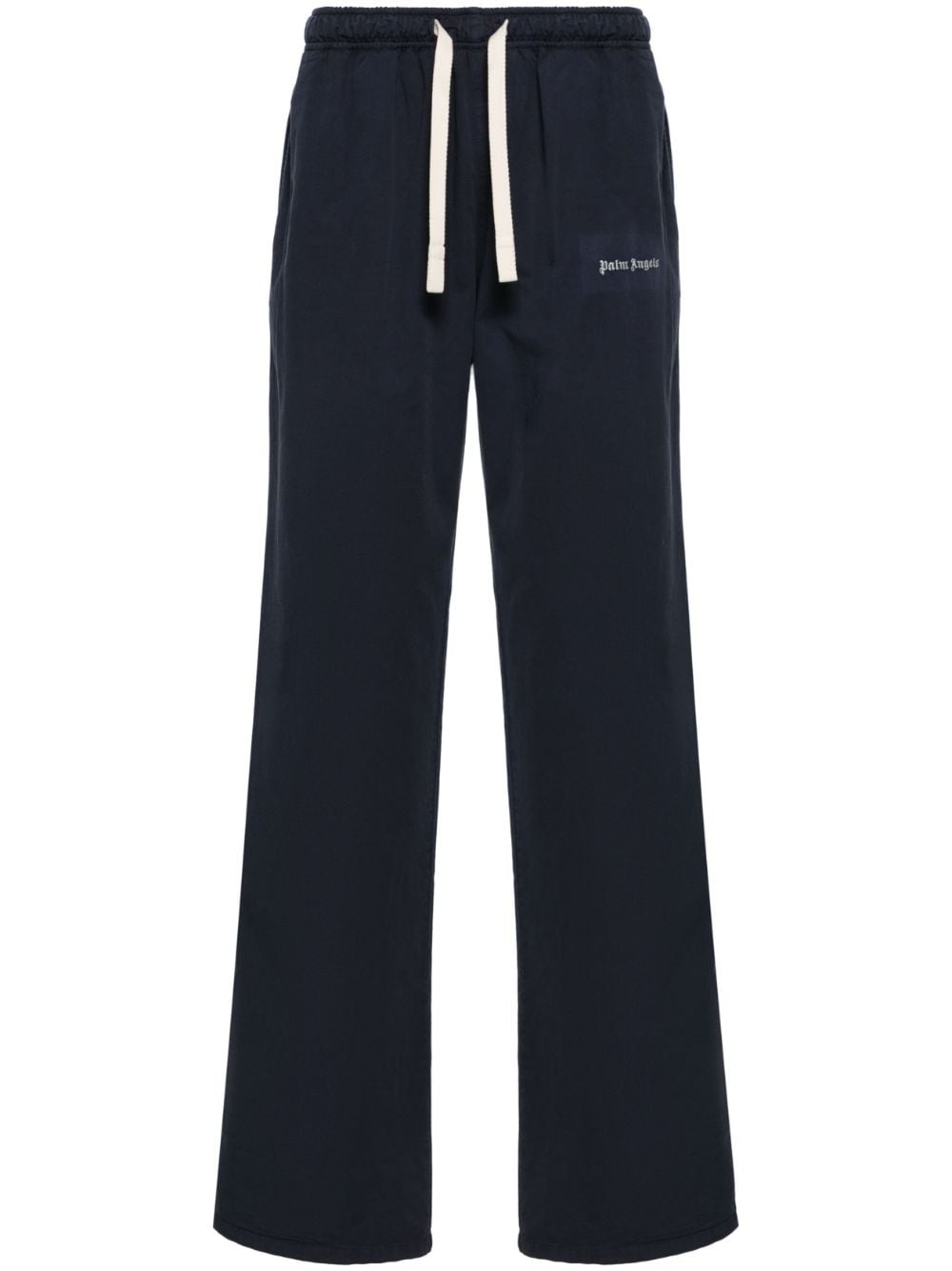 mid-rise straight-leg trousers A combination of durable fabric and signature athleisure codes, these Palm Angels trousers are crafted from black twill cotton with an elasticated drawstring waistband. They’re cut to a wide-leg profile and stitched with a white logo at the side in signature Old English lettering. Highlights - Midnight blue - Cotton - Interlock twill weave - Embroidered logo to the side - Mid-rise - Elasticated drawstring waistband - Two side slit pockets - Two rear welt pockets - Straight leg Made in Italy Composition Outer: Cotton 100%, Polyester 100% Lining: Cotton 100% SIZE & FIT Model measurements Height 6 ft 2 in(1.87 m) Bust/Chest 38.18 in(97 cm) Hips 36.61 in(93 cm) Waist 29.13 in(74 cm) FittingInformation Designed with a wide leg, offering a loose and roomy fit Adjust this piece’s waistband to your preference using the drawstring Made from a midweight non-stretch fabric This piece fits true to size – take your usual size