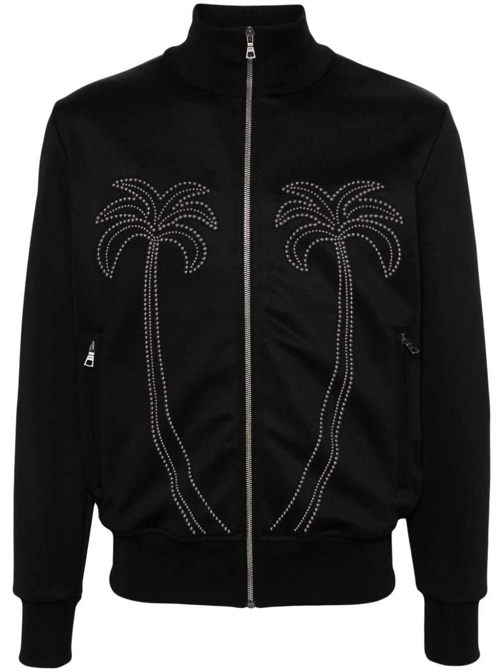 Milano studded track jacket A statement update on a sporty design, this black Milano Stud jacket by Palm Angels is cut to a track-inspired high-neck silhouette equipped with two zip-fastening pockets, allowing essentials to be stowed away. It is embellished with silver-tone studs arranged as palm trees and a circular logo, adding a branded metallic accent. Highlights - Black - Silver-tone stud detailing - High neck - Front zip fastening - Long sleeves - Two side zip-fastening pockets - Straight hem Made in Italy Composition Outer: Polyester 100%, Aluminium 100% Lining: Polyester 100% SIZE & FIT Model measurements Height 6 ft 2 in(1.87 m) Bust/Chest 38.18 in(97 cm) Hips 36.61 in(93 cm) Waist 29.13 in(74 cm) FittingInformation Designed for a regular fit, offering a comfortable loose fit throughout the body The ribbed hem offers a close, comfortable fit Made from a midweight non-stretch fabric, this piece offers minimal elasticity when worn This piece fits true to size – take your usual size Washing instructions Hand Wash
