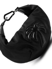 mini Palm hobo bag Palm Angels' hobo bag is emblazoned with the brand's Big Palm logo at the centre of its design. The raised logo patch blends in with the black background, lending a signature touch to the slouchy silhouette. Highlights - Black - Leather trim - Palm tree patch - Single top handle - Top clasp fastening - Top zip fastening - Main compartment - Internal logo patch - Cotton lining - Silver-tone hardware Made in Italy Composition Lining: Cotton 100% Outer: Leather 100%, Polyamide 90%, Acrylic 10% SIZE & FIT Measurement DEPTH 3.93 in(10 cm) HANDLE 2.75 in(7 cm) HEIGHT 7.08 in(18 cm) WIDTH 7.87 in(20 cm)