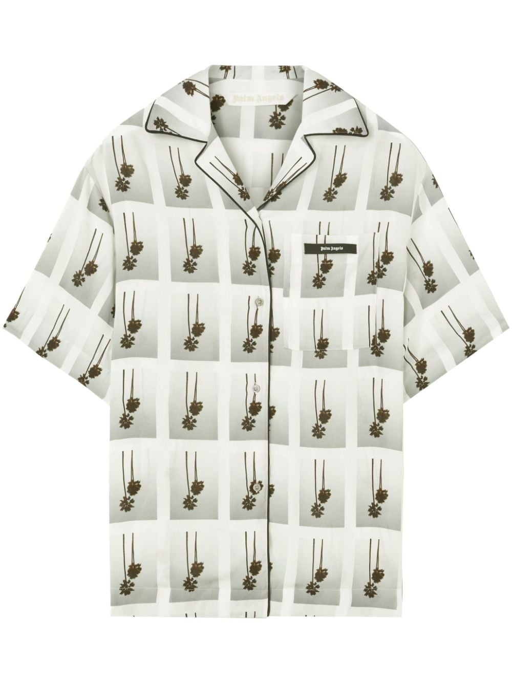 Mirage palm-tree print bowling shirt An unmistakable signifier of the brand, Palm Angels' signature palm tree print covers this white and grey shirt, alongside a logo patch at the chest patch pocket, making this casual silhouette instantly recognisable. Highlights - White/grey - Palm tree print - Notched lapels - Front button fastening - Chest patch pocket - Logo patch to the front - Straight hem Made in Italy Composition Viscose 100%