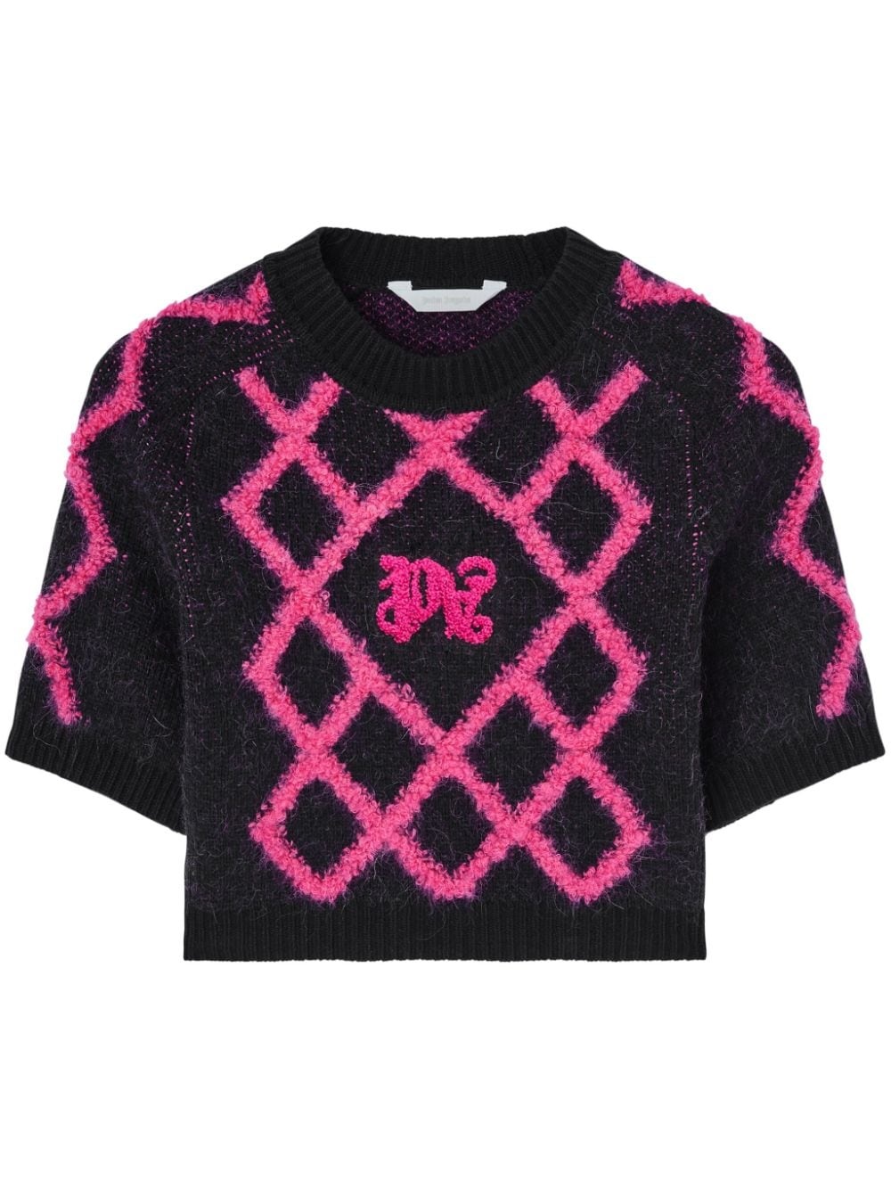 Monogram argyle-pattern crop top Highlights - Navy blue/fuchsia pink - Wool blend - Knitted construction - Argyle check pattern - Textured finish - Embroidered monogram - Crew neck - Short sleeves - Ribbed cuffs and hem - Cropped Made in Italy Composition Wool 80%, Polyamide 20% Washing instructions Read Manufacturer Guidelines
