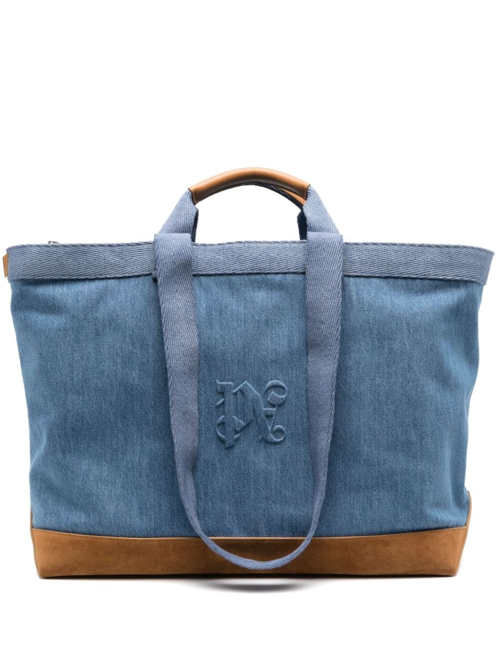 monogram-embossed denim tote bag Crafted from denim with brown suede trims, this Palm Angels tote bag is characterised by the label's gothic-style PA monogram on its front. Thanks to its four straps, it can be worn handheld or over the shoulder. Highlights - Blue - Denim - Suede trim - Two top handles - Two shoulder straps - Embossed monogram pattern - Open top - Main compartment - Silver-tone hardware Made in Italy Composition Lining: Cotton 100% Outer: Calf Leather 100%, Cotton 100% SIZE & FIT Measurement DEPTH 6.69 in(17 cm) HANDLE 3.93 in(10 cm) HEIGHT 14.96 in(38 cm) STRAP 16.14 in(41 cm) WIDTH 18.5 in(47 cm)