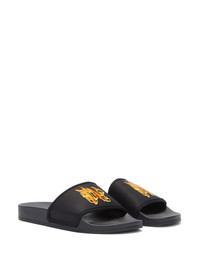 monogram-embossed pool slides These slides from Palm Angels are printed with the label's PA monogram in gold flames. They're made from faux leather and fitted with a non-slip sole. Highlights - Black/orange - Faux leather - Logo print to the front - Branded insole - Moulded footbed - Slip-on style - Round open toe Made in Italy Composition Sole: Polyurethane 100% Lining: Polyester 100% Outer: Polyester 100%
