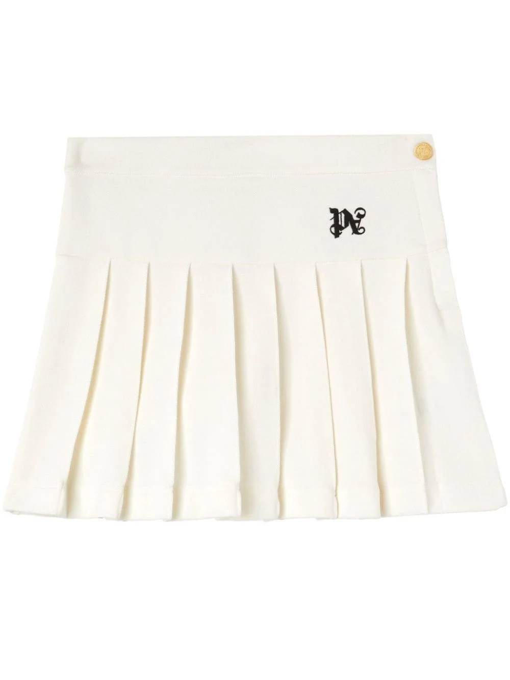 monogram-embroidered pleated miniskirt This Palm Angels miniskirt exudes a preppy feel with its knife-pleated design and monogram detailing on the front. It's cut from off-white cotton in Italy with a low-rise waist and fastens at the side with an embossed gold-tone button, for an elevated finish. Highlights - Off-white/black - Cotton - Knife-pleat design - Embroidered logo to the front - Low-rise - Side button fastening - Embossed gold-tone button - Thigh-length Made in Italy Composition Cotton 100%, Polyester 100% Washing instructions Read Manufacturer Guidelines