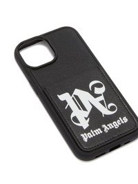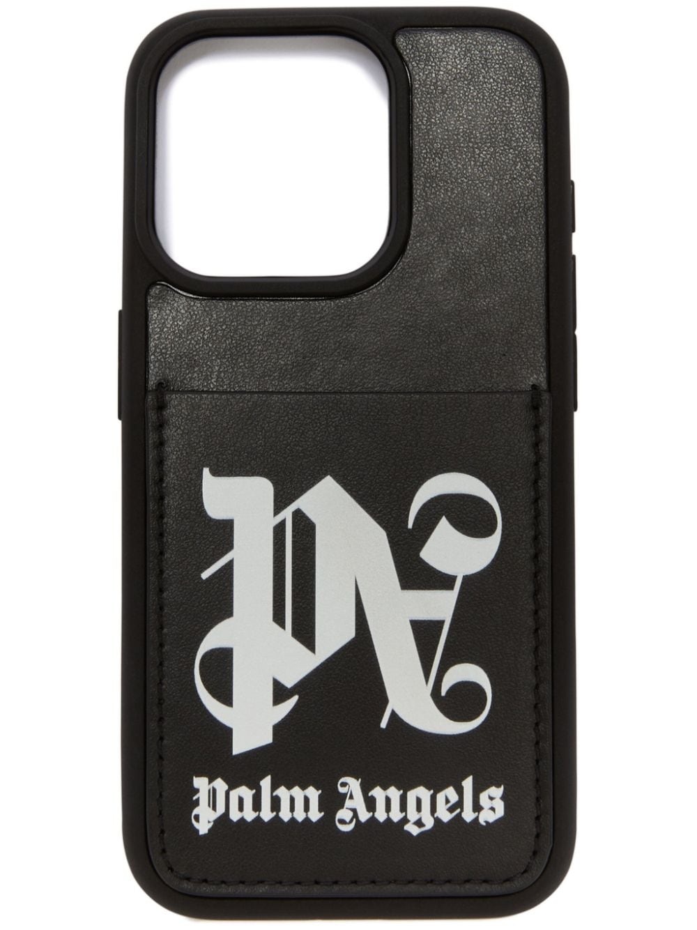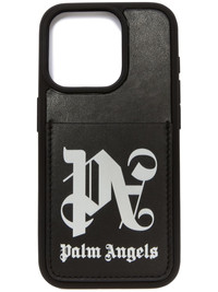 monogram iPhone 15 case Palm Angels' logo takes the focus of this iPhone 15 case. The detail appears printed at the front in white, contrasting with the rest of its black leather construction. Highlights - Black - Calf leather - Recycled polyester blend - Monogram print - Cut-out detailing - Curve-edge body - Iphone 15 Made in Italy Composition Calf Leather 60%, Recycled Polyester 40%