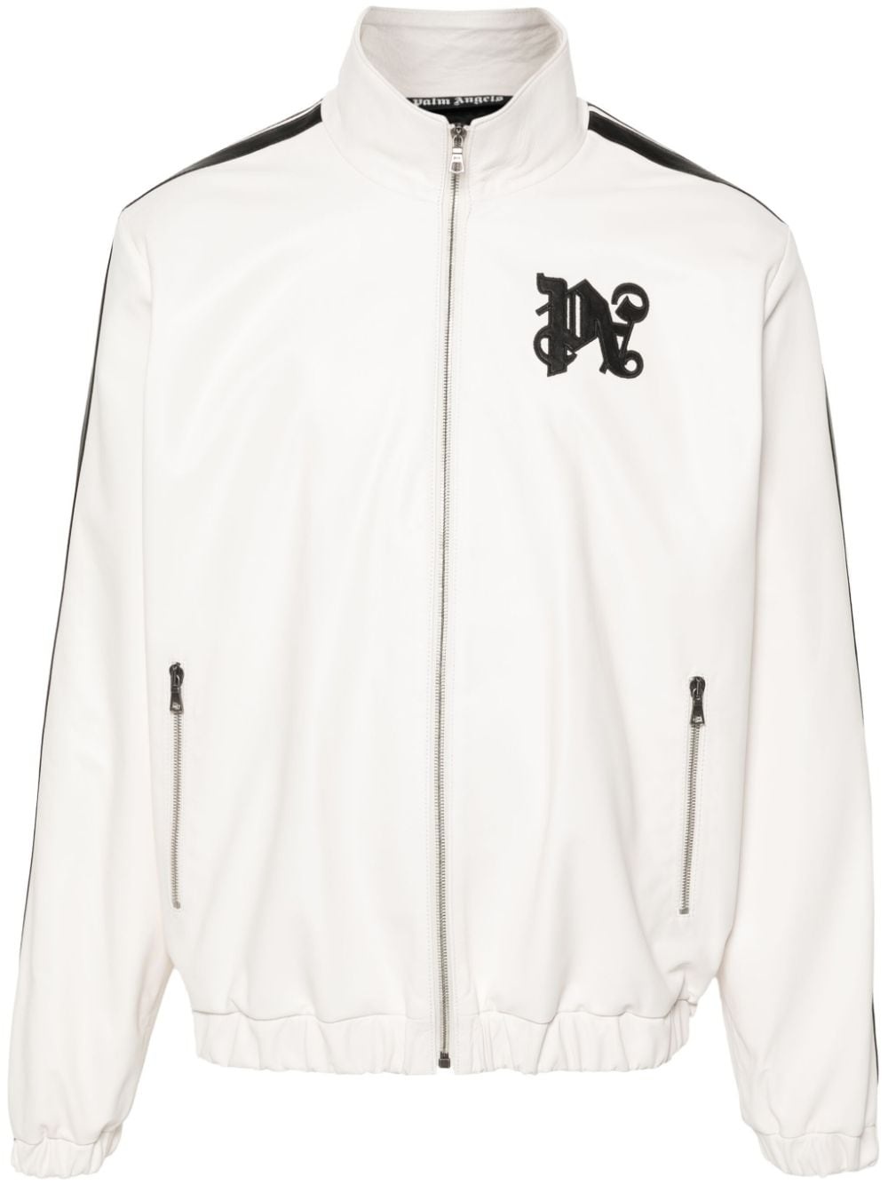 monogram-patch leather jacket This leather jacket by Palm Angels is cut to a relaxed silhouette with elasticated cuffs that lend an athletic feel. Boasting a monogram applique on the chest, the jacket is instantly recognisable as a Palm Angels creation. Highlights - Off-white/black - Lambskin - Cracked effect - Logo patch at the chest - Stripe detailing to the sleeves - Branded zip puller - Stand-up collar - Front zip fastening - Long sleeves - Elasticated cuffs - Two front zip-fastening pockets - Internal slip pocket - Elasticated hem - Full lining - Authenticity qr code Imported Composition Outer: Lambskin 100%, Polyester 79%, Polyurethane 19%, Viscose 2% Lining: Cupro 100%, Cotton 100% SIZE & FIT Model measurements Height 6 ft 2 in(1.87 m) Bust/Chest 36.22 in(92 cm) Hips 37 in(94 cm) Waist 27.95 in(71 cm) FittingInformation Designed for a relaxed fit, this piece allows for comfort and movement when worn The elasticated hem allows for movement and a comfortable fit Firm leather offering little flexibility to maintain its durability and sturdiness This piece fits true to size – take your usual size Washing instructions Specialist Cleaning