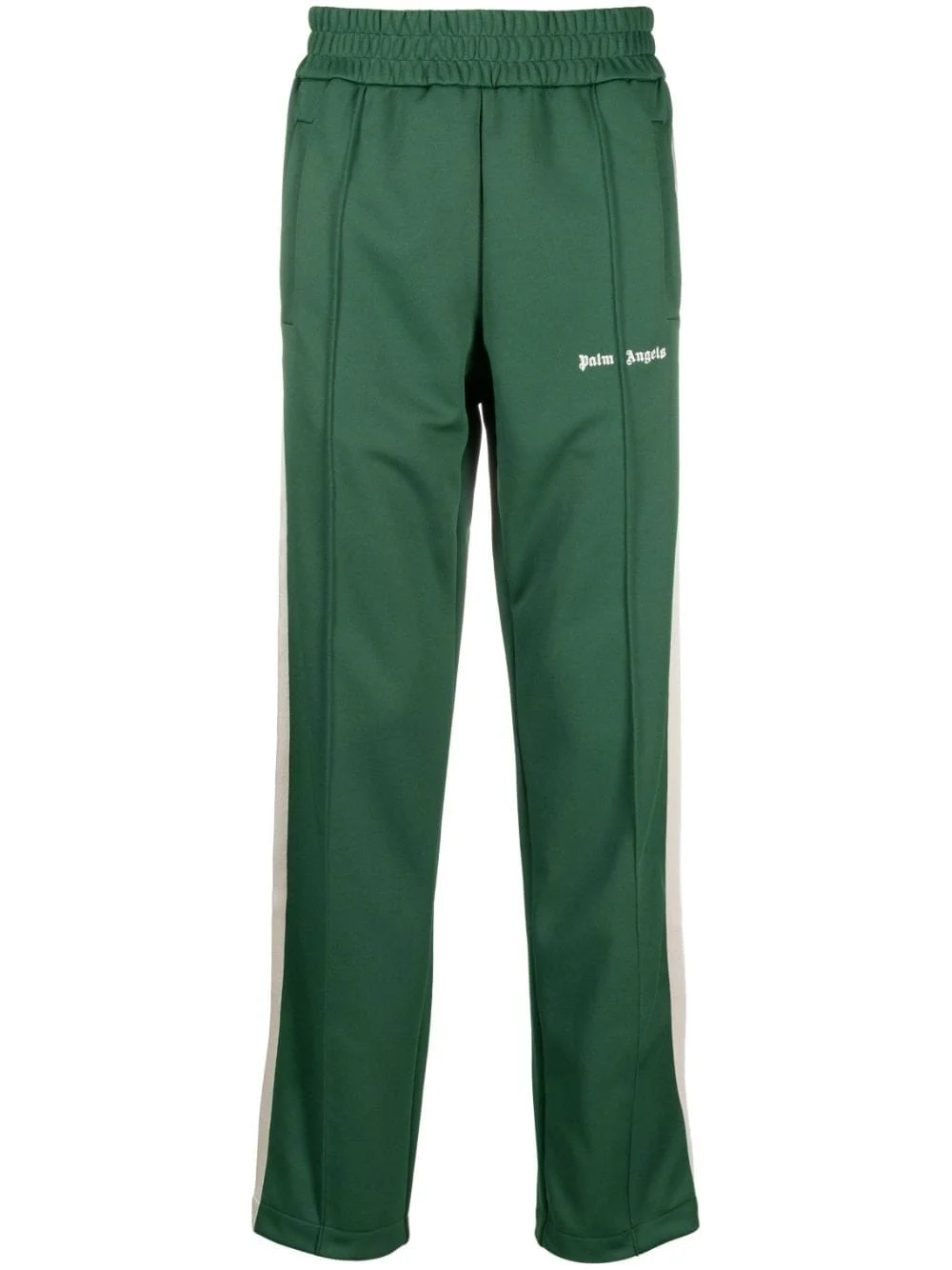 New Classic track pants Drawing on inspiration from retro track styles, Palm Angels presents the New Classic track pants - with a green and cream white colourway. The stripes at the sides add an athletic aesthetic, while the pressed crease down the front creates an elongating effect. Highlights - Green - Logo print at the leg - Side stripe detailing - Elasticated waistband - Two side welt pockets - Straight leg - Ankle zips Made in Italy Composition Lining: Polyester 100% Outer: Polyester 100% SIZE & FIT Model measurements Height 6 ft 2 in(1.87 m) Bust/Chest 38.18 in(97 cm) Hips 36.61 in(93 cm) Waist 29.13 in(74 cm) FittingInformation Designed for a straight-leg, allowing for an unrestricted and comfortable fit over the leg The zipped hems allow you to adjust the fit throughout the calves and ankles Made from a midweight non-stretch fabric, this piece offers minimal elasticity when worn This piece fits true to size – take your usual size Washing instructions Hand Wash