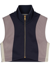 PA monogram cropped track vest top Highlights - Navy blue/lilac/white - Logo print to the rear - Side stripe detailing - Funnel neck - Front zip fastening - Sleeveless - Cropped Made in Italy Composition Outer: Polyester 100% Lining: Polyester 100% Washing instructions Read Manufacturer Guidelines