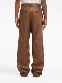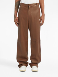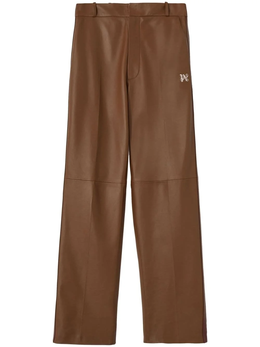 PA monogram leather track pants Palm Angels modernises the classic track pants to reflect the label's quirky style. This version is constructed from smooth brown leather, complemented by side stripe detailing and the brand's PA monogram logo at the side. Highlights - Coffee brown - Leather - Logo print to the side - High waist - Belt loops - Concealed fly and button fastening - Side stripe detailing - Two side slit pockets - Two rear flap pockets - Straight leg Imported Composition Lining: Cupro 100%, Cotton 100% Outer: Leather 100%