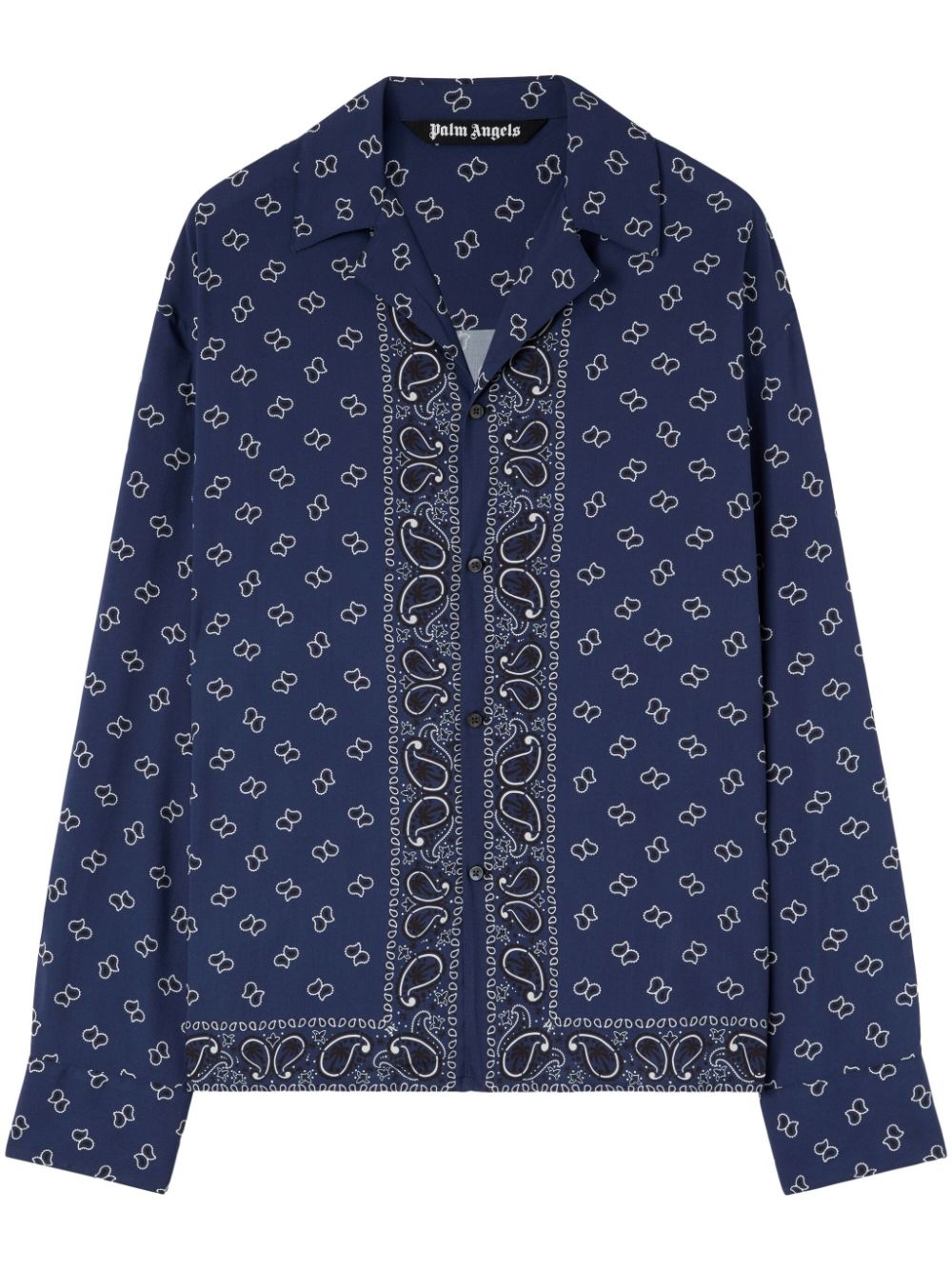 paisley-print long-sleeve shirt Highlights - Navy blue/white - Paisley print - Cuban collar - Front button fastening - Long sleeves - Buttoned cuffs Imported Composition Viscose 100%