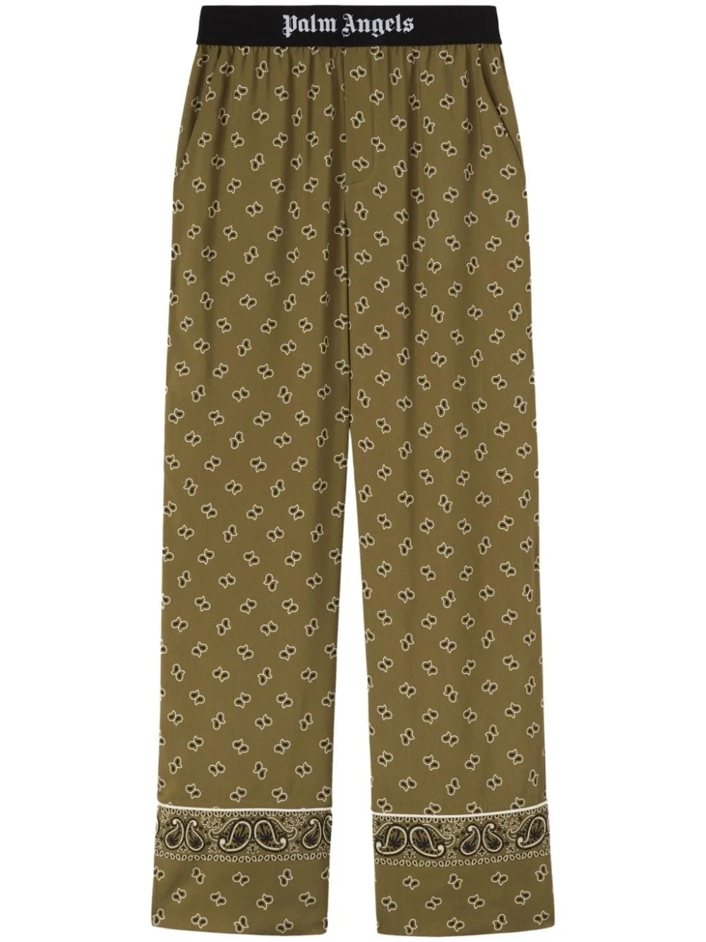 paisley-print straight-leg trousers Nodding to classic pajama styles, these Palm Angels trousers are defined by an all-over paisley print. They're rendered in khaki-green with a branded elasticated waistband, a loose-cut leg and are finished with piped trimming. Highlights - Khaki/black - Paisley print - Piped-trim detailing - Elasticated logo waistband - Two side slash pockets - Straight leg - Rear welt pocket - Long length Made in Italy Composition Viscose 100%, Cotton 100%, Polyamide 67%, Polyester 23%, Spandex/Elastane 10% Washing instructions Read Manufacturer Guidelines