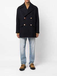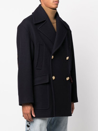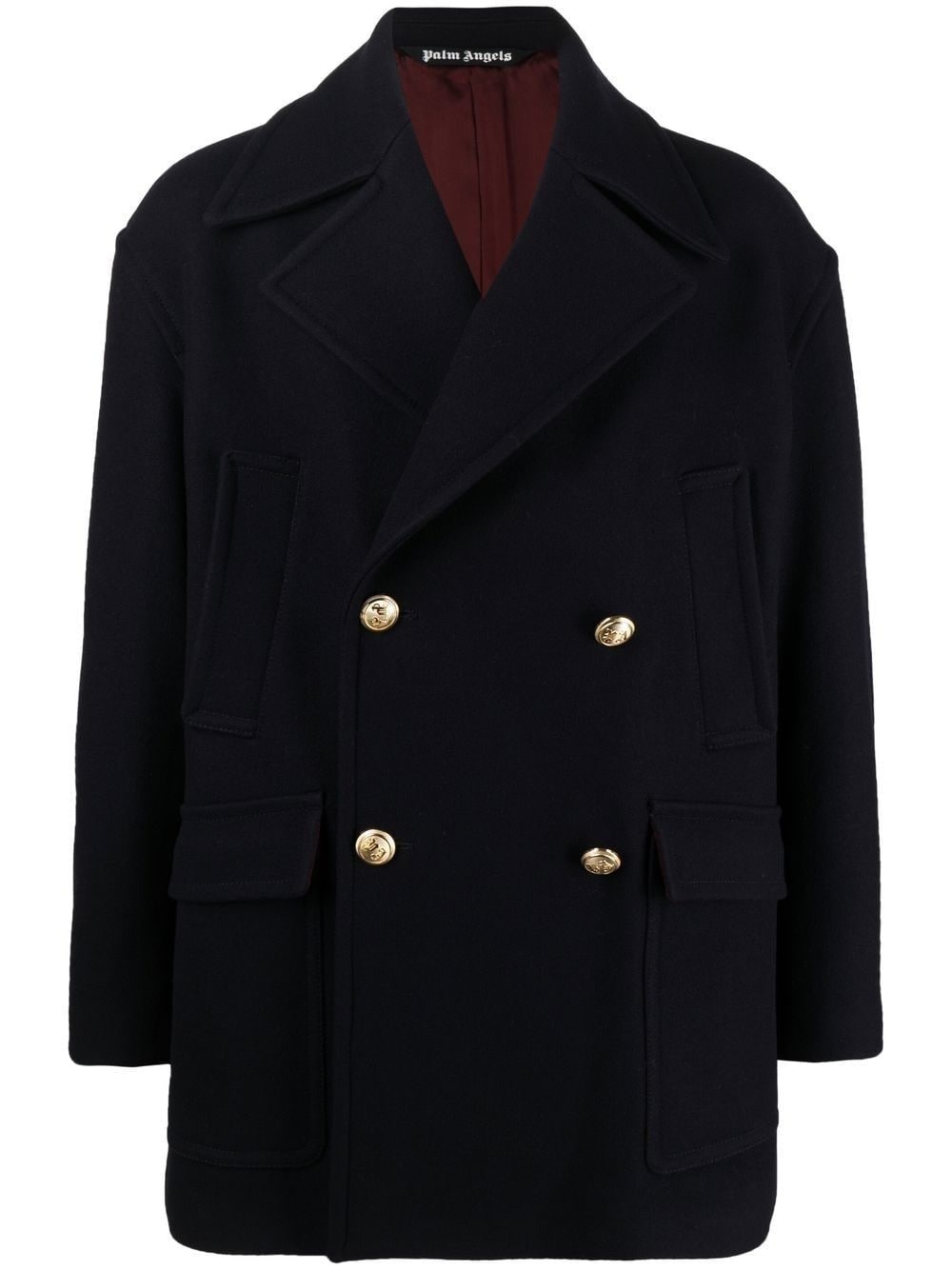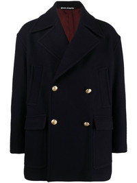 palm tree-embroidered coat Palm Angels lays claim to this double-breasted wool-blend coat through the palm tree embroidered detailing that decorates the sleeves. Made in Italy Composition Outer: Virgin Wool 80%, Polyamide 20% Lining: Cupro 100%