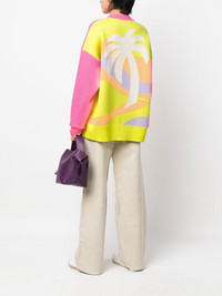 palm-tree intarsia-knit jumper A statement to Palm Angels' signature relaxed Los Angeles attitude, this fuchsia pink jumper is printed with an intarsia-knit off-white palm tree pattern, a signature motif of the brand to the back, contrasting against the yellow, orange and blue backdrop. Made in Italy Composition Outer: Virgin Wool 100% Lining: Virgin Wool 100% Trims: Polyester 100% SIZE & FIT Model measurements Height 5 ft 10 in(1.78 m) Bust/Chest 33.07 in(84 cm) Hips 35.82 in(91 cm) Waist 25.98 in(66 cm) FittingInformation This piece fits true to size. We recommend you get your regular size Cut for a loose fit Made with a mid-weight fabric Washing instructions Hand Wash