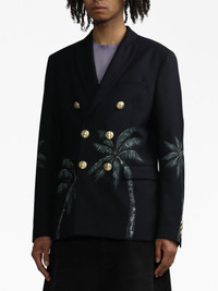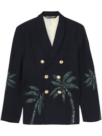 Palms Classic double-breasted blazer Palm Angels' affinity for sharp silhouettes is captured in the clean lines of this navy-blue blazer. Characterised by its double-breasted construction, it's elevated by a bold palm tree graphic that nods to the label's laid-back Californian influences. Highlights - Navy blue - Virgin wool blend - Palm tree print - Gold-tone buttons - Dart detailing - Peak lapels - Shoulder pads - Long sleeves - Buttoned cuffs - Double-breasted button fastening - Full lining - Straight hem Made in Italy Composition Polyester 55%, Virgin Wool 45%