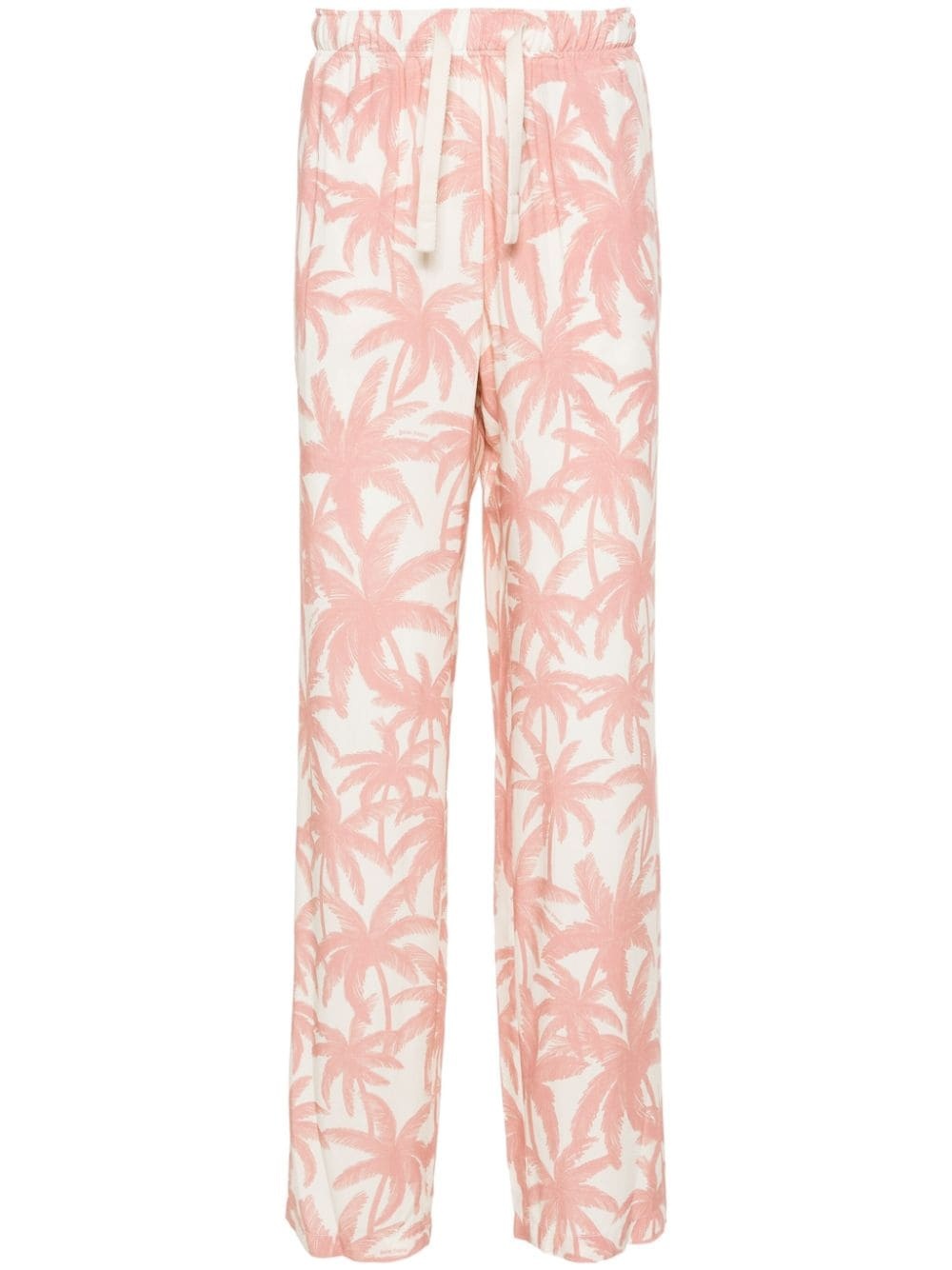Palms-print wide-leg trousers Palm Angels takes its name and inspirations from California’s tropical trees. These wide-leg track pants are cut from airy white voile and printed with the silhouetted foliage in pale pink. Highlights - Off-white, light pink - Voile - Palm tree print - Elasticated drawstring waistband - Two side slit pockets - Rear welt pocket - Wide leg Imported Composition Viscose 100% SIZE & FIT Model measurements Height 6 ft 2 in(1.87 m) Bust/Chest 36.22 in(92 cm) Hips 37 in(94 cm) Waist 27.95 in(71 cm) FittingInformation Designed with a wide leg, offering a loose and roomy fit Adjust this piece’s waistband to your preference using the drawstring Made from a lightweight non-stretch fabric This piece fits true to size – take your usual size Washing instructions Dry Clean Only