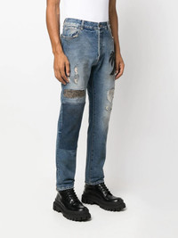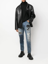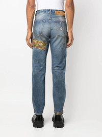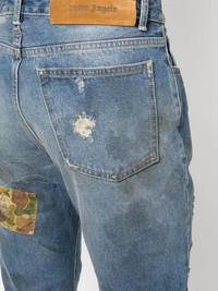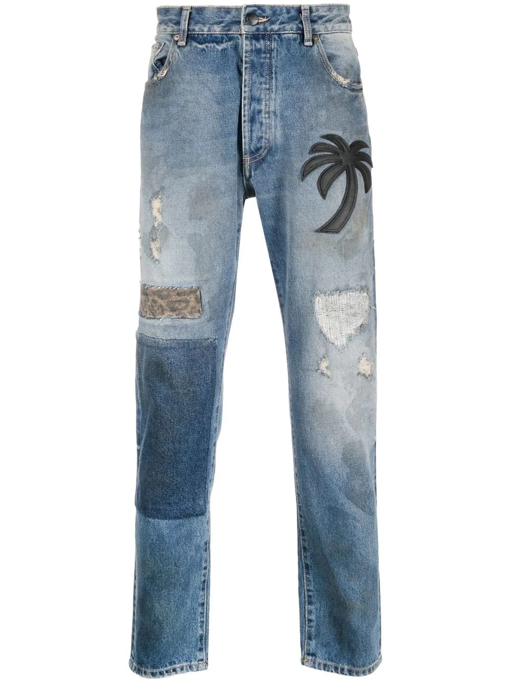patchwork straight-leg jeans Palm Angels adds a playful twist to an otherwise refined staple with these jeans. The straight-leg profile is updated with patchwork detailing to add to the silhouette. Made in Italy Composition Outer: Cotton 100% Lining: Cotton 100% Trims: Calf Leather 100%