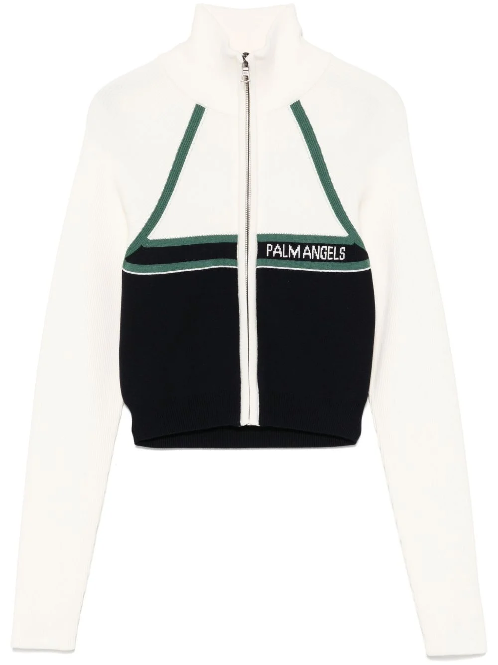 Racing cardigan Highlights - White - Front zip fastening - Ribbed knit - Jacquard logo motif - High neck Made in Italy Composition Viscose 70%, Polyester 30% SIZE & FIT Model measurements Height 5 ft 10 in(1.78 m) Bust/Chest 33.85 in(86 cm) Hips 36.61 in(93 cm) Waist 26.77 in(68 cm) FittingInformation Designed for a slim fit that sits just away from the body offering a close yet comfortable fit Cropped in length Made with a midweight knit, this piece offers some stretch Washing instructions Machine Wash