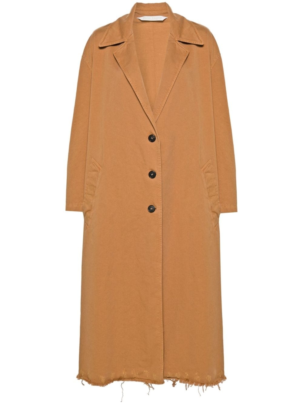 raw cut-hem single-breasted coat Highlights - Caramel brown - Cotton - Twill weave - Logo print to the rear - Notched lapels - Long sleeves - Two side slit pockets - Rear slit - Full lining - Raw-cut hem - Front button fastening Made in Italy Composition Lining: Cotton 100%, Cupro 100% Outer: Cotton 100% SIZE & FIT Model measurements Height 5 ft 10 in(1.78 m) Bust/Chest 31.49 in(80 cm) Hips 37 in(94 cm) Waist 23.62 in(60 cm) FittingInformation Designed to be unstructured, offering a loose fit throughout The vented hem offers movement at the rear Made from a midweight non-stretch fabric This piece fits true to size – those with a petite frame may wish to take one size down Washing instructions Dry Clean Only
