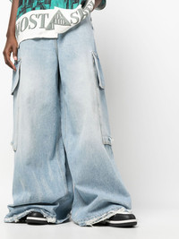 ripped-detail wide-leg jeans Channelling Palm Angel's laid-back attitude, these light blue jeans are characterised by their distinctive wide-leg silhouette. Subtle ripped detailing and oversized cargo pockets decorate the floor-length pair. Highlights - Light blue - Denim - High-waisted - Concealed fly and button fastening - Classic five pockets - Two front cargo pockets - Ripped detailing - Logo patch to the rear - Wide leg - Long length Made in Italy Composition Lining: Polyester 65%, Cotton 35% Outer: Cotton 100%, Leather 100% Washing instructions Machine Wash