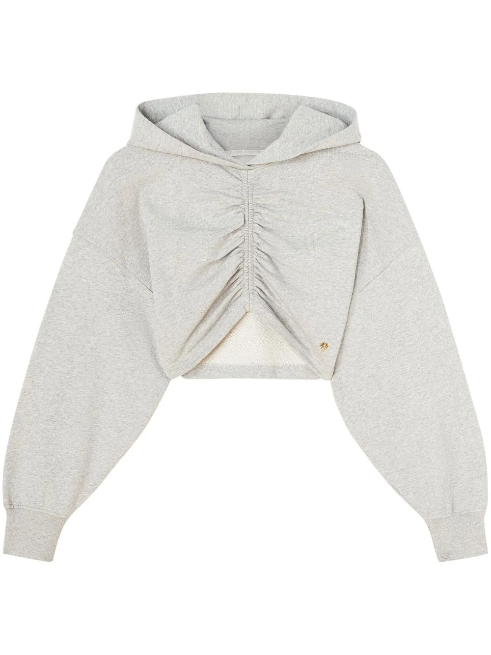 ruched-detail cropped hoodie Made in Portugal from pure cotton, this cropped hoodie by Palm Angels gains a contemporary twist with a central ruched detail at the front. The loose silhouette speaks to the brand's streetwear inspirations, while an asymmetric hem brings depth to the garment. Highlights - Light grey - Cotton - Ruched detailing - Mini logo tag - Classic hood - Drop shoulder - Long sleeves - Ribbed cuffs - Asymmetric hem - Cropped Imported Composition Cotton 100% SIZE & FIT FittingInformation Cropped in length