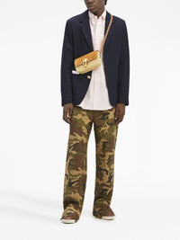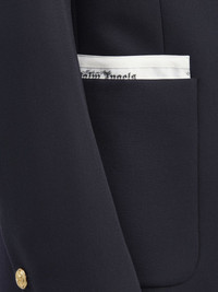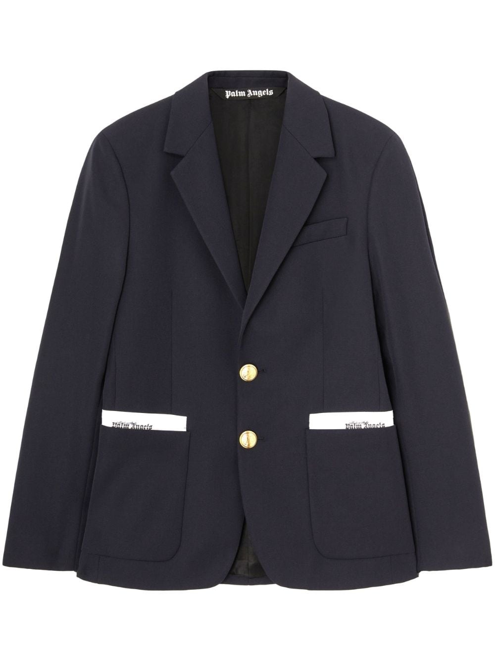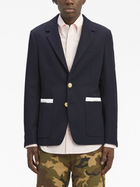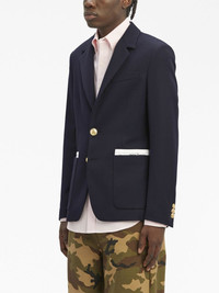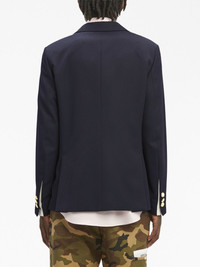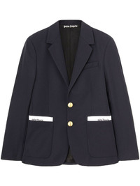 Sartorial Tape button-up blazer Highlights - Navy blue/off-white - Logo print to the front - Gold-tone buttons - Notched lapels - Front button fastening - Long sleeves - Buttoned cuffs - Chest welt pocket - Two front patch pockets - Straight hem Made in Italy Composition Outer: Polyester 55%, Virgin Wool 45% Lining: Cotton 100%, Cupro 100%