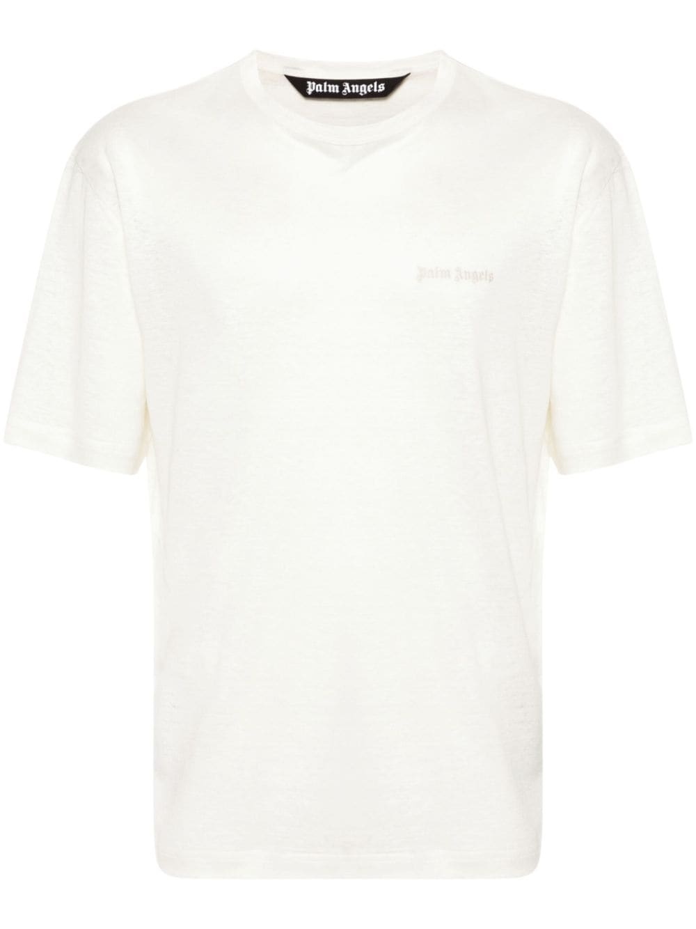 semi-sheer linen T-shirt Cut in Italy, this off-white T-shirt from Palm Angels is made from breathable crisp linen that lends its understated design a semi-sheer quality. A matching logo is embroidered at the chest for a branded flair. Highlights - White - Linen/flax - Semi-sheer construction - Ribbed trim - Embroidered logo at the chest - Crew neck - Drop shoulder - Short sleeves - Straight hem Made in Italy Composition Linen/Flax 100% SIZE & FIT Model measurements Height 6 ft 2 in(1.87 m) Bust/Chest 38.18 in(97 cm) Hips 36.61 in(93 cm) Waist 29.13 in(74 cm) FittingInformation Designed for a relaxed fit, this piece allows for comfort and movement when worn Made from a midweight non-stretch fabric, this piece offers minimal elasticity when worn This piece fits true to size – take your usual size Washing instructions Hand Wash