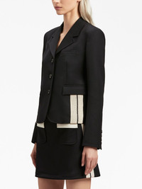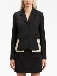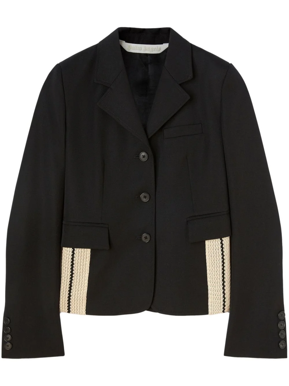 side-embellished fitted blazer Streetwear label PALM ANGELS combines a signature Italian flair with a contemporary aesthetic inspired by American subcultures. Both are imbued in this blazer, where the brand reinvents the single-breasted silhouette with stripe detailing, for a sporty take on the tailoring staple. Highlights - Black/light beige - Virgin wool blend - Stripe detailing - Notched lapels - Front button fastening - Long sleeves - Buttoned cuffs - Slit pocket at the chest - Two front flap pockets - Straight hem Made in Italy Composition Outer: Polyester 55%, Virgin Wool 45% Lining: Cupro 100% SIZE & FIT FittingInformation Designed for a slim fit that sits just away from the body offering a close yet comfortable fit This piece fits true to size – take your usual size