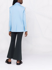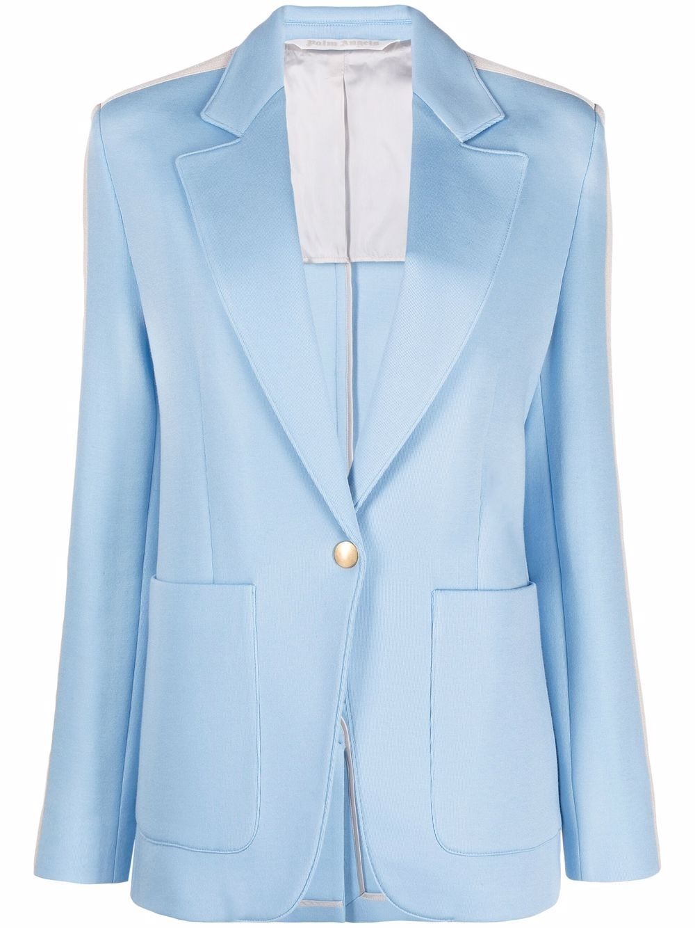 side-stripe buttoned blazer Reworking a classic silhouette with contemporary detailing, Palm Angels adds an unmistakable finish to this buttoned blazer. Presented in a blue hue, this piece is accented with side stripes. Made in Italy Composition Outer: Polyester 100%, Cotton 52%, Viscose 48% Lining: Viscose 100% SIZE & FIT Model measurements Height 5 ft 10 in(1.78 m) Bust/Chest 31.1 in(79 cm) Hips 33.85 in(86 cm) Waist 24.01 in(61 cm) FittingInformation This piece fits true to size. We recommend you get your regular size Cut for a loose fit Made with a mid-weight fabric Washing instructions Dry Clean Only