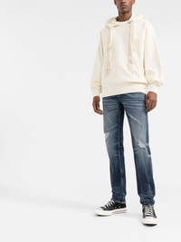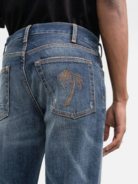 slim-fit distressed straight-leg jeans Inspired by the beaches of California, Palm Angels' palm tree motif is embroidered at the rear of these slim-fit jeans, making them instantly recognisable of the brand. Made in Italy Composition Outer: Leather 100%, Polyester 100%, Cotton 66%, Organic Cotton 32%, Spandex/Elastane 2% Lining: Polyester 65%, Cotton 35% SIZE & FIT Model measurements Height 6 ft 2 in(1.88 m) Bust/Chest 35.03 in(89 cm) Hips 35.82 in(91 cm) Waist 27.95 in(71 cm) FittingInformation This piece fits true to size. We recommend you get your regular size Cut for a slim fit Made with a mid-weight stretch fabric