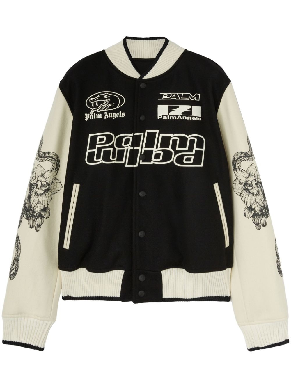 snake-print varsity jacket Highlights - Black - Front press-stud fastening - Two front jetted pockets - Ribbed cuffs and hem - Logo print embellishment Made in Italy Composition Outer: Wool 75%, Polyamide 25% Lining: Cupro 100% Washing instructions Dry Clean Only