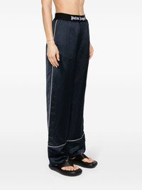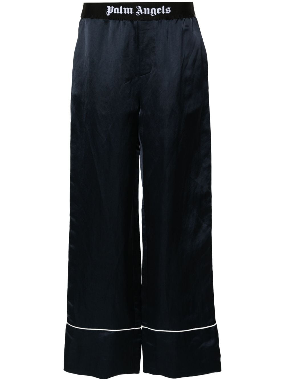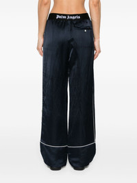 Soiree pyjama pants Palm Angels favours comfort with its Soiree pyjama trousers. They're crafted from a blend of linen to a flowing wide-leg profile and fitted with a branded elasticated waistband. Highlights - Navy blue/black - Linen blend - High-waisted - Elasticated logo waistband - Rear button-fastening jetted pocket - Piped-trim detailing - Pull-on style Made in Italy Composition Outer: Polyamide 67%, Linen/Flax 56%, Viscose 44%, Polyester 23%, Elastane 10% Lining: Cotton 100% SIZE & FIT Model measurements Height 5 ft 11 in(1.8 m) Bust/Chest 33.07 in(84 cm) Hips 37.4 in(95 cm) Waist 25.19 in(64 cm) FittingInformation Designed for a straight-leg fit, these trousers allow for a close fit at the waist and an unrestricted, comfortable fit over the leg The elasticated waist allows for a comfortable fit Made from a midweight non-stretch fabric This piece fits true to size – take your usual size