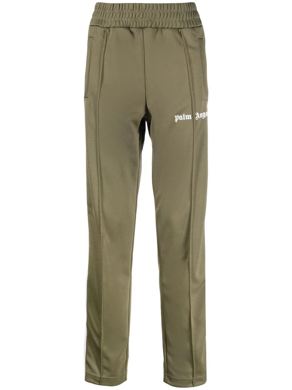 straight-leg track pants straight-leg track pants from PALM ANGELS featuring khaki, side stripe detailing, logo print at the leg, high waist, slip pockets to the sides and ankle-length. Made in Italy Composition Outer: Polyester 100% Lining: Polyester 100% SIZE & FIT Model measurements Height 6 ft 2 in(1.89 m) Bust/Chest 37 in(94 cm) Hips 37 in(94 cm) Waist 28.93 in(73.5 cm) FittingInformation This piece fits true to size. We recommend you get your regular size Cut for a relaxed fit Made with a mid-weight fabric Washing instructions Machine Wash