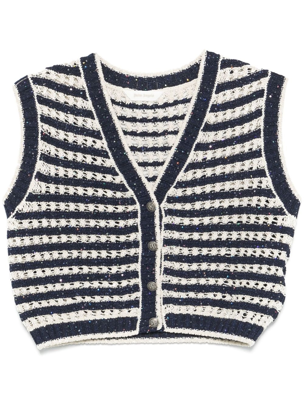 striped knit vest Highlights - Midnight blue - Front button fastening - Sequin embellishment - V-neck - Sleeveless Made in Italy Composition Brass 100%, Polyester 46%, Cotton 36%, Viscose 16%, Other fibres 2% SIZE & FIT Model measurements Height 5 ft 10 in(1.78 m) Bust/Chest 33.85 in(86 cm) Hips 36.61 in(93 cm) Waist 26.77 in(68 cm) FittingInformation Designed for a relaxed fit, this piece allows for comfort and movement when worn Made with a midweight knit, this piece offers some stretch