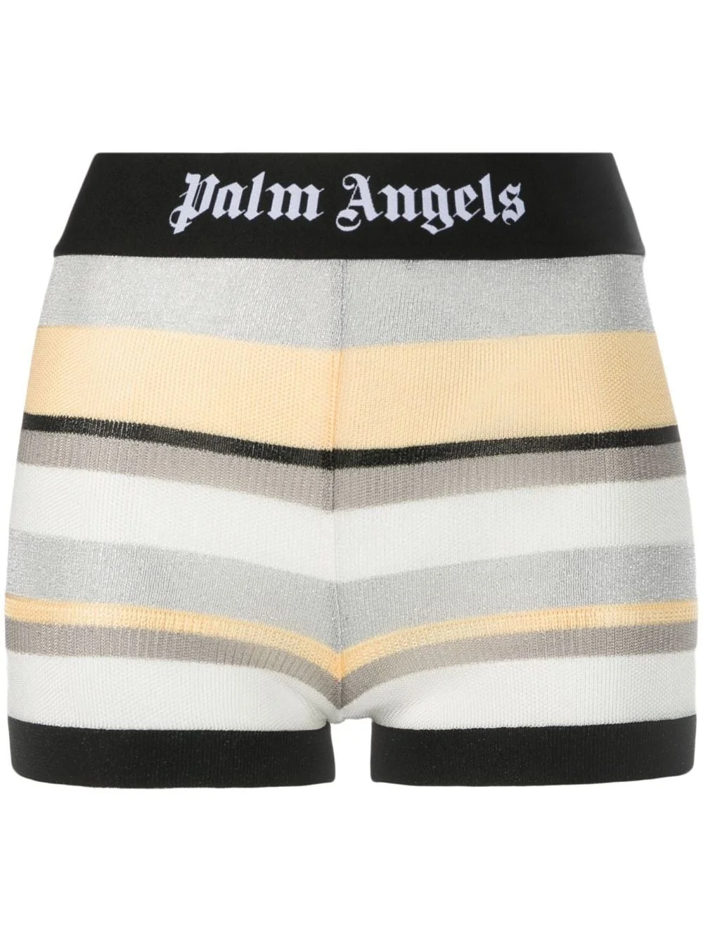 striped lurex-knit mini shorts Spun with a fine knit, these Palm Angels shorts are woven with lurex for a shimmery touch. The pair's tight-fitting mini silhouette nods to styles from the 50s. Highlights - White/black/light yellow - Fine knit - Lurex detailing - Horizontal stripe pattern - High-waisted - Logo waistband - Thigh-length Made in Italy Composition Viscose 68%, Acetate 25%, Polyester 4%, Polyamide 3% SIZE & FIT Model measurements Height 5 ft 10 in(1.77 m) Bust/Chest 32.67 in(83 cm) Hips 35.43 in(90 cm) Waist 23.62 in(60 cm) FittingInformation Designed for a close fit throughout Made with a lightweight knit, this piece offers some stretch This piece fits true to size – take your usual size Washing instructions Dry Clean Only