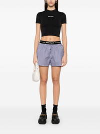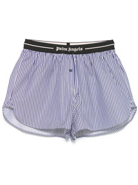 striped shorts Highlights - Navy blue - Elasticated logo waistband - Twill weave - Button fly fastening - Curved hem Made in Italy Composition Cotton 100%, Polyester 91%, Elastane 9% SIZE & FIT Model measurements Height 5 ft 10 in(1.78 m) Bust/Chest 33.85 in(86 cm) Hips 36.61 in(93 cm) Waist 26.77 in(68 cm) FittingInformation Designed for a loose fit, offering comfort and movement when worn Made from a lightweight stretch fabric, this piece offers elasticity and flexibility when worn